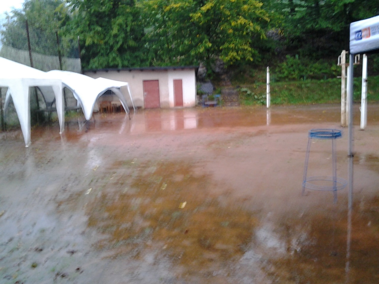 Většina akcí konaných v tento den padla jako dívky na E 55. Děkujeme všem, kteří přišli. Přišli a nám s nimi bylo dobře. Přišli místní a přespolní. Občas si člověk říká, když připravuje několik měsíců akci, která se meteorologicky zcela, nebo vůbec nevyvede, jestli to má vůbec smysl. Ale nakonec se v pláštěnkách dotrmácí pár zoufalců, ze kterých se vyklubou lidé s vaší krevní skupinou .... Jen pro ilustraci přikládáme ranní foto v 7.00 hod (zaplavené hřiště, polozborcené stany a za hodinu se má startovat.